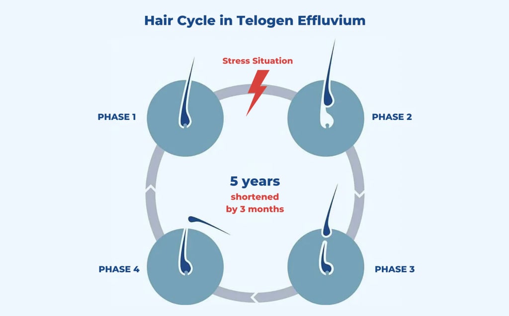 Remember how hair grows in cycles? Normally, most of your hair is in the active growth phase (anagen), with only a small percentage resting. When something shocks your system, many growing hairs get the message to "pause" and enter the resting phase. About 2-4 months later, all those resting hairs shed at once, creating the dramatic hair loss that characterizes telogen effluvium.