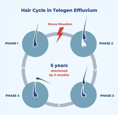 Telogen effluvium is a form of temporary hair loss that occurs when a large number of hair follicles are pushed into the resting (telogen) phase of the hair growth cycle simultaneously. Instead of the normal 10-15% of your hair being in this resting phase, suddenly 30% or more of your follicles shut down at once.